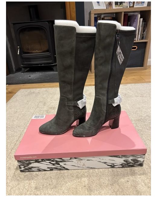 Moda in Pelle Grey Suede Lizeth Knee Highwith Zip & Stretch Back New with box. These boots by Moda in Pelle feature a knee-high, dual-textured leather bootsconsist of a stretch fabric back panels, high block crocodile embossed heelsand a metal chain details around the back top of the heel