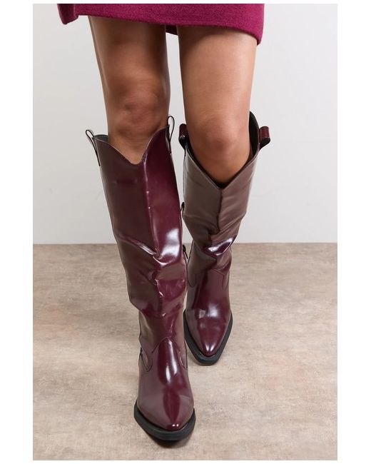 These boots feature a flattering knee-high silhouette that pairs beautifully with printed skirts as shown, or with skinny jeans tucked in for a more casual approach. The pointed toe adds a touch of sophistication while maintaining the authentic western aesthetic.