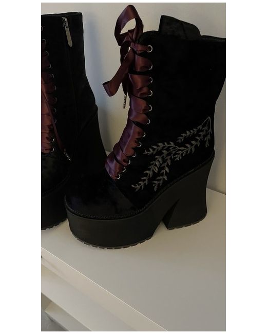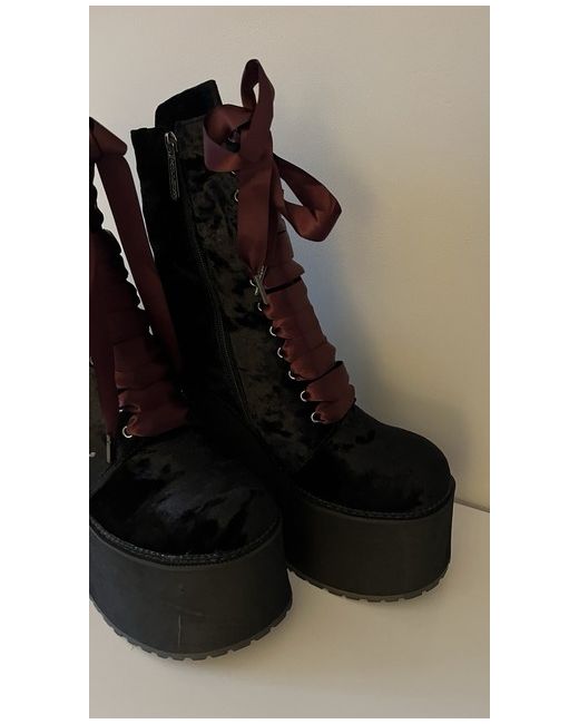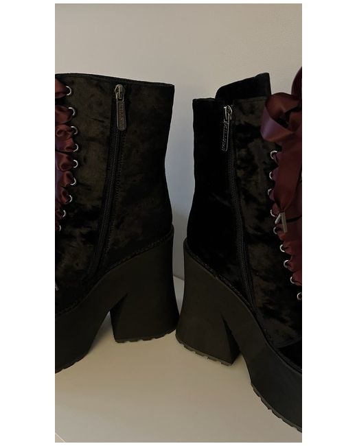 Only tried on but I can’t walk in them 🤣 not due to any fault of the boots I’m just not used to walking in heels or even platforms They do seem very stable though due to how chunky the sole is Beautiful velvety material Burgundy and black ribbon for laces Zip on the side