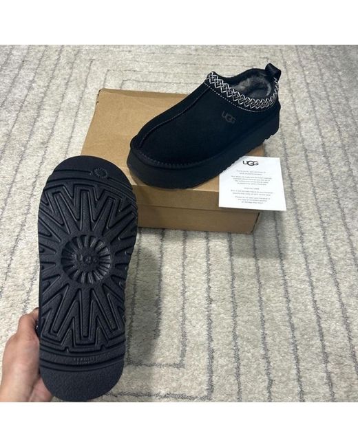 The Black UGG Tasman Slippers are a stylish and comfortable choice for women in UK shoe size 6.5. These slip-on slippers feature a thick platform sole, perfect for keeping feet warm and cosy during the winter season. Made from suede with a standard shoe width, these UGG Australia slippers have a slip-on closure and are ideal for casual occasions. The sleek black colour and platform style add a trendy touch to these slipper shoes, making them a must-have for any woman's wardrobe. - comes with a box and packaging Box is slightly damaged