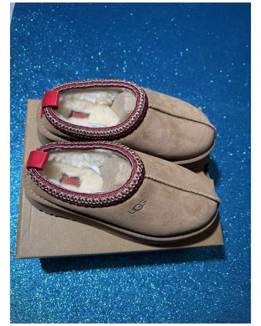 The UGG Tazz slippers in chestnut brown are a stylish and comfortable choice for casual wear during the winter season. Featuring a slip-on style with a round toe and low heel height, these slippers offer convenience and ease of wear. Made from high-quality suede with a rubber outsole, they provide a standard shoe width for a comfortable fit. The UGG logo adds a touch of sophistication to these classic brown slippers, making them a perfect addition to any woman's wardrobe.