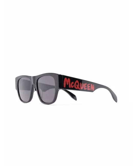 black/red rectangle frame logo print at the arm nose pads straight arms curved tips These glasses come with a protective case.
