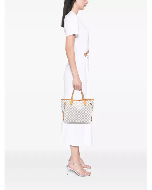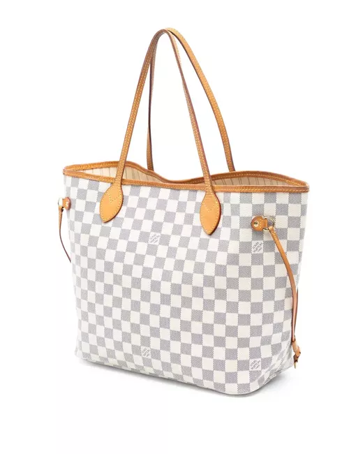 The Neverfull MM features a damier azur canvas body with vachetta leather trim, flat vachetta leather straps, an open top with a lobster clasp closure, and an interior zip pocket. White. Serial Number: SP1111. This item has no inclusions. Condition: GOOD. This previously owned and used item is in good condition with minimal signs of use. This may include fading of material or plating and scratches. Please refer to the photos on this product page for a detailed view of the item, including any damages declared.