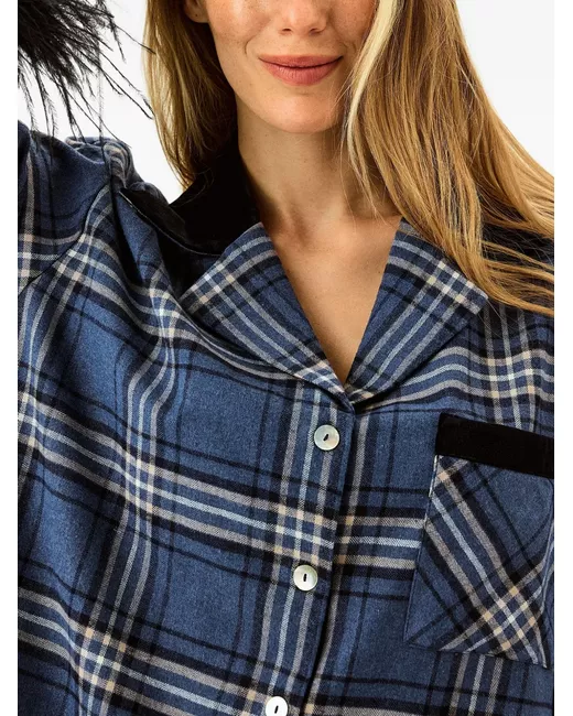 Women's Blue Checked Cotton-Flannel Set with Feathers Navy Checkered