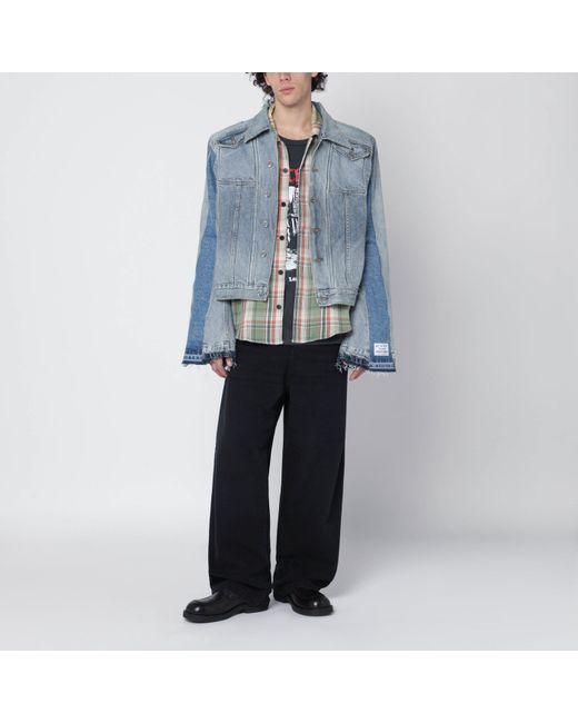 Light indigo-blue cotton denim jacket by Gallery Dept. featuring button closure, wide long sleeves with added contrasting light-blue denim insert, logo patch at the cuff, two flap pockets with button, rear logo patch, adjustable hem, raw-cut details, localized distressing, and rips.