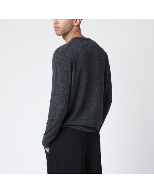 Grey wool-blend crew-neck sweater by Maison Margiela, featuring long sleeves, ribbed trims, hem patch, and signature Four Stitches on the back.