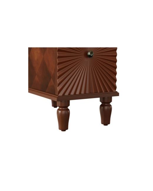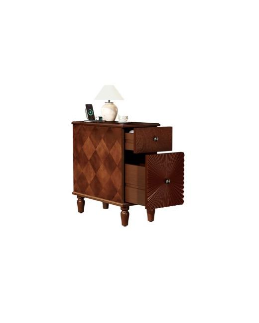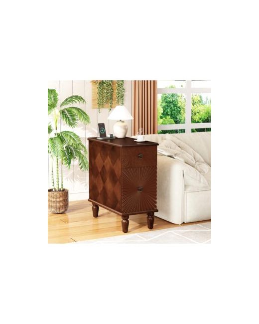 The end table feature with charge station included 2 Ac outlets, 2 Usb ports, 2 drawers for storage, the table frame used Rubber wood, others used Mdf. The lower large drawer is designed with unique linear concave pattern that looks more elegant and stylish. The side table arrives fully assembled, just need to install the feet to saving you time.