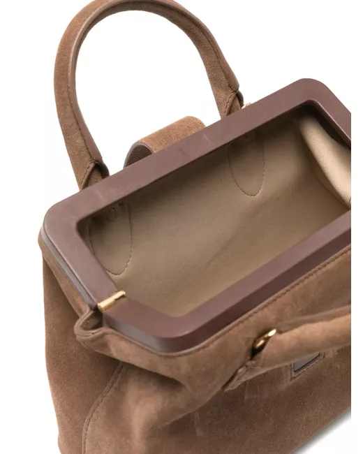 brown top handle gold-tone logo plaque detachable shoulder strap panelled construction metal feet at base