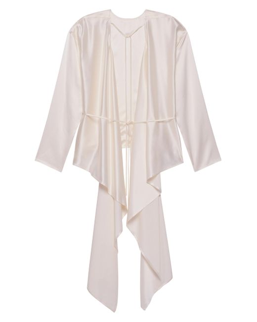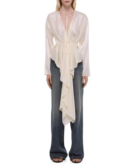 The top from Helmut Lang features a relaxed fit and long sleeves, crafted of silk with a scarf drape detail. Tieneck Long sleeves Self-tie belt 100% silk Dry clean Imported SIZE & FIT About 33.5" from shoulder to hem Model measurements: 5'10" tall Model is wearing a US size Small. Contemporary Sportswear - Helmut Lang > Helmut Lang > Saks Fifth Avenue. Helmut Lang. Color: Ivory. Size: XS.