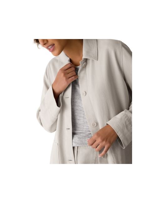 Channel workwear-inspired style with this Eileen Fisher jacket, featuring a classic collar for timeless appeal. Front pockets add practical, polished detail, making it both functional and stylish for everyday wear.