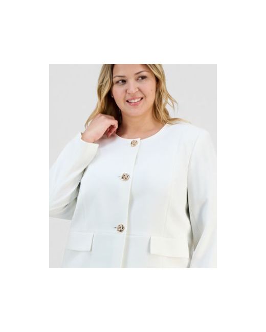 Define your professional look with this effortlessly chic plus size collarless button-front jacket from Kasper, perfectly tailored to provide a polish silhouette at the office.