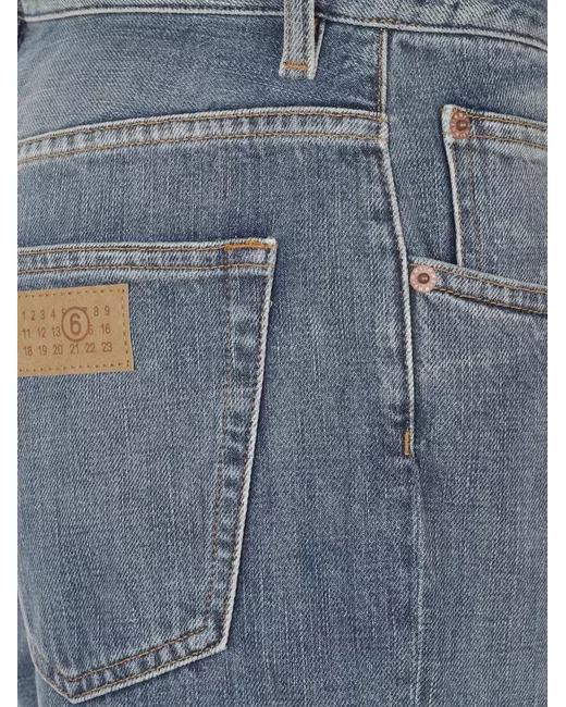 blue five pocket style split hem straight leg belt loops rear logo patch