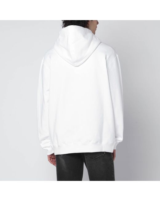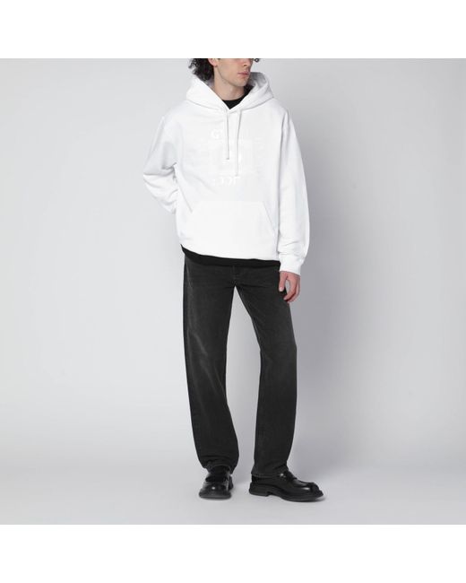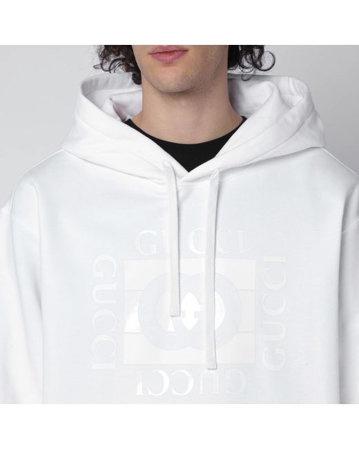 White brushed cotton jersey hoodie by Gucci, featuring tonal GG interlocking logo print on the chest, drawstring hood, front kangaroo pocket, long sleeves, and ribbed trims.