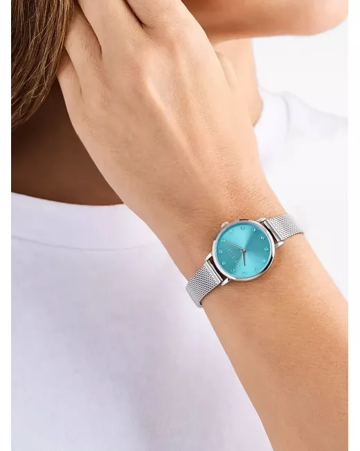 blue, silver-tone round case crystal embellishment baton hands mesh bracelet clasp fastening
