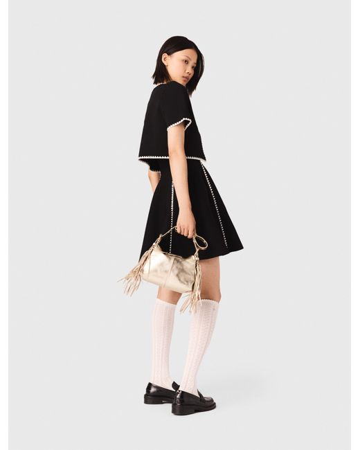 Maje polyester Cropped black knit cardigan Contrasting white scalloped trim 3 hook-and-eye fastenings Short sleeves Fine; tight knit Back to urban energy: a structured, graphic cropped cardigan is a must-have, ideal for rewriting the rules of a city wardrobe. This piece plays on contrasts with its white scalloped trim accentuating every edge, its short sleeves and its cropped fit. Wear it open or closed for an assertive, contemporary look. Wear it over the matching black dress, add a mini Miss M bag and loafers for a sophisticated monochrome silhouette, with a twist of bright details.. This