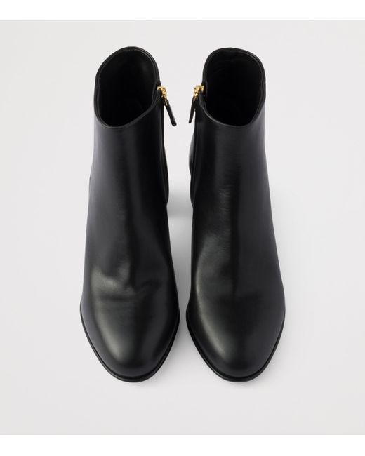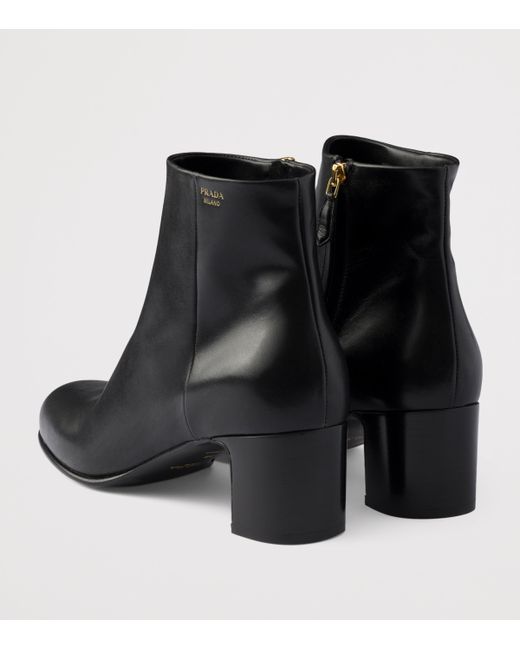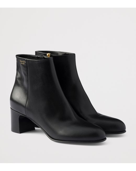 Clean lines define these Prada ankle boots, where smooth leather gives the design its richness and a rounded toe softens the overall shape. Set on a dependable block heel, they strike a balance between comfort and presence, carrying you easily from morning to evening.