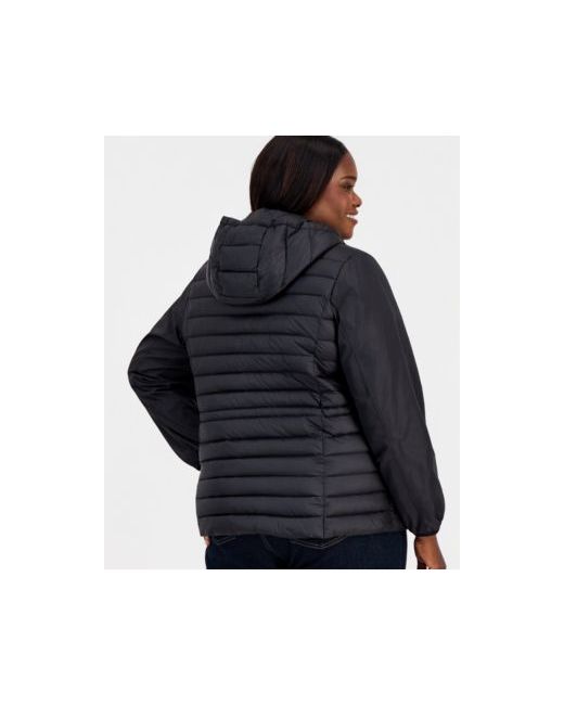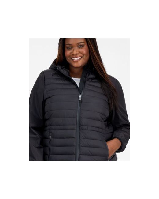 A mixed-media layer from Calvin Klein, this plus size packable coat is complete with handy side pockets and a weather-ready hood.