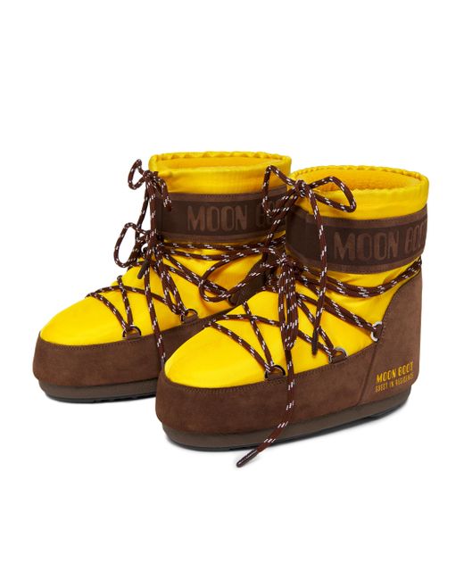 Designed with soft fleece lining, these Moon Boot Icon Low lace-up boots pair bright nylon with contrast suede trim and a thick, padded sole. Round toe Lace-up Suede/nylon upper Textile lining Rubber sole Imported Please note: These boots are designed with an ambidextrous fit and can be worn on either the left or right foot. Women's Shoes - Cold Weather > Moon Boot > Saks Fifth Avenue. Moon Boot. Color: Sunflower. Size: 2.