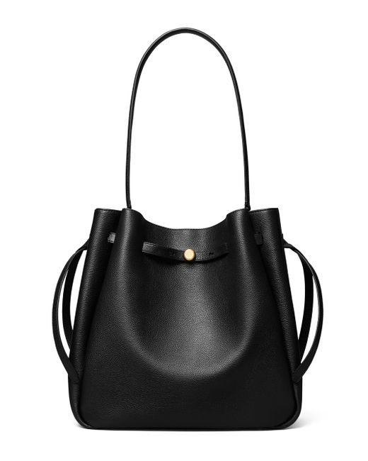 Crafted of suede, Tory Burch's Romy bucket bag features a gathered silhouette and styled with a slim belt on the exterior. Shoulder strap Magnetic snap closure Suede Lining: polyamide/polyurethane Imported SIZE About 12.25"W x 12.25"H x 5"D Shoulder strap: about 11.75" drop ABOUT THE BRAND Since debuting her brand in 2004, New York-based designer Tory Burch has made an impact on the fashion world with her handbags and shoes, and playful-yet-polished clothing. Today, Burch remains inspired by color and travel, with her vibrant collections bursting with prints, and her instantly recognizable double-T logo drawing from Moroccan architecture. Handbags - Tory Burch Handbags > Tory Burch > Saks Fifth Avenue. Tory Burch. Color: Black.