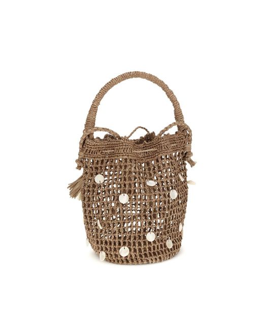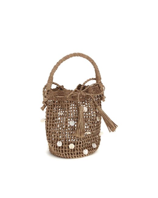 The Precious Moments Bucket Bag is handcrafted from natural raffia and embellished with elegant mother-of-pearl details. Equipped with a handle and shoulder strap, it features a practical drawstring closure that combines functionality and style. Season: SS26 Composition: 100% Raffia