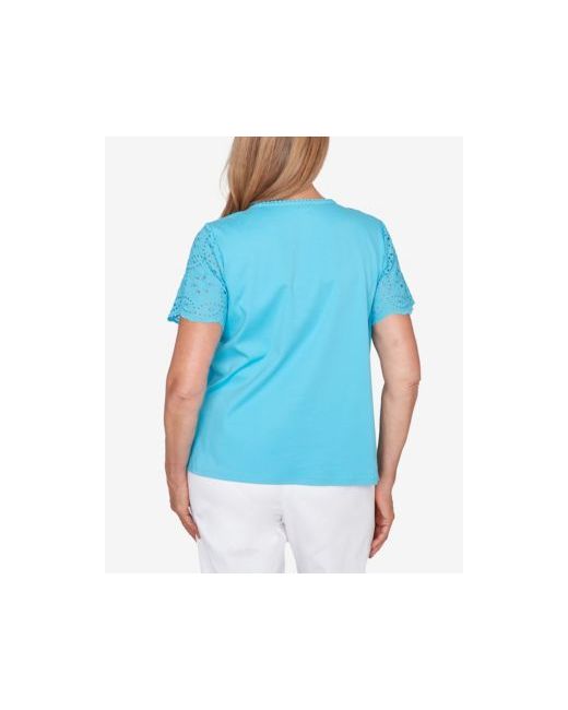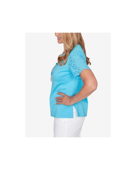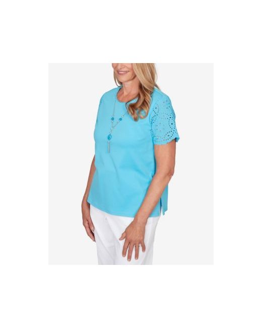 This elevated solid tee is graced with delicate eyelet sleeves that bring soft texture and charm. A classic crew neckline and straight hem keep the silhouette polished, while the coordinating necklace adds a finishing touch of elegance.