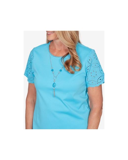 Blue Womens Classic Solid Eyelet Sleeve T-Shirt with Necklace