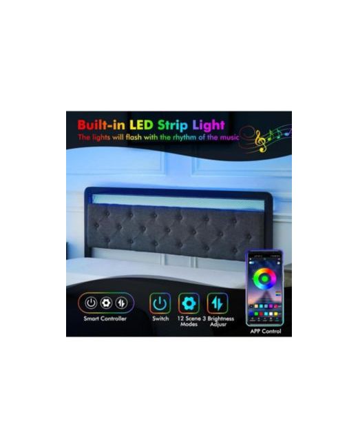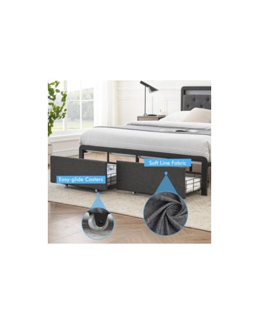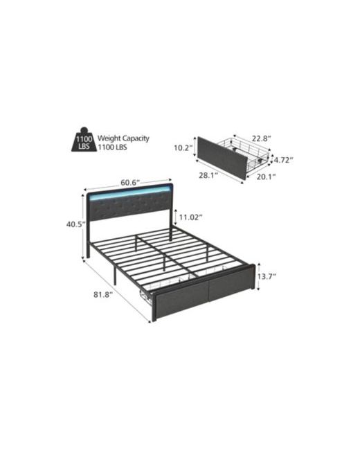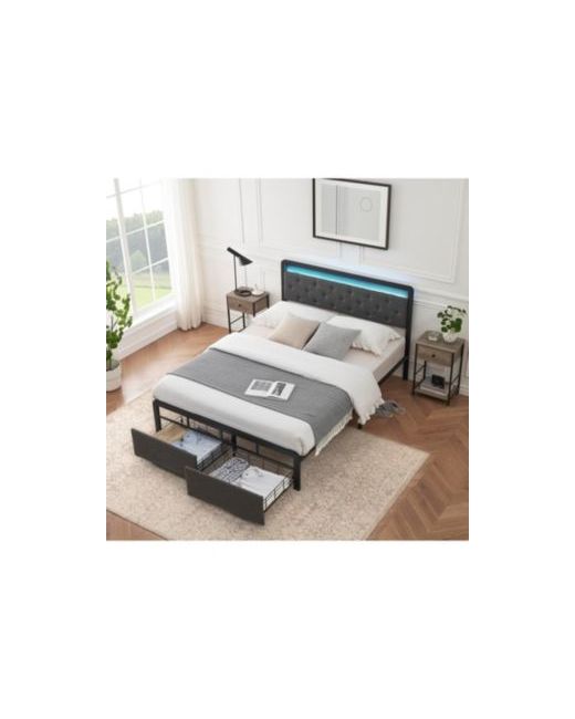Queen upholstered bed frame featuring luxurious button tufting, Led lighting, and two spacious storage drawers. Equipped with strong metal slats for comfort and mattress support without needing a box spring. Designed for a quiet, stylish bedroom experience.