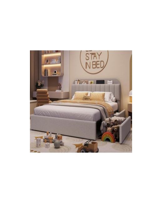 Grey queen-size boucle upholstered bed with bookcase headboard and two drawers. Designed for kids rooms, it provides noise-free sleep, no box spring requirement, and easy assembly for a tidy and stylish environment.