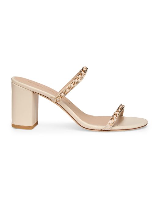 Crafted of supple leather, Stuart Weitzman's Soluxe sandals are accented with chain-embellished straps. Almond toe Slips on Leather upper Made in Spain SIZE Heel: about 2.95" (75mm) ABOUT THE BRAND Designer Stuart Weitzman started his career designing for his father's shoe company, before launching his own brand in 1986. Known for his glamorous pumps and over-the-knee boots, Weitzman has also incorporated unique materials in his designs, ranging from Lucite and wallpaper to cork, vinyl and even gold. Today, the label continues to create classic, feminine silhouettes that balance both comfort and style. Women's Shoes - Stuart Weitzman Wmn Shoe > Stuart Weitzman > Saks Fifth Avenue. Stuart Weitzman. Color: Linen. Size: 10.