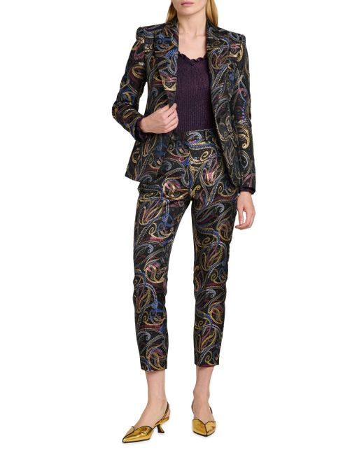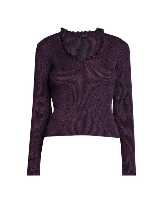 Crafted in Italy, Etro's fitted long-sleeve top features a metallic rib-knit finish and ruffled round neckline. Ruffled round neck Long sleeves Pulls over 80% viscose/20% metallic fibers Dry clean Made in Italy SIZE & FIT Model measurements: 5'10" tall Model is wearing a US size 4 ABOUT THE BRAND The Italian fashion house renowned for its eclectic prints and signature paisley motif has been a family-run business since its inception in 1968. Creative Director Marco de Vincenzo continues the brand's legacy with the rich textiles and patterns still used in its clothing, accessories and home décor. Designer Lifestyle - Etro > Etro > Saks Fifth Avenue. Etro. Color: Rosso Bordeaux Melange. Size: 2.
