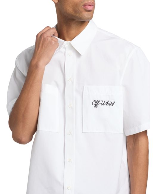 Crafted of cotton poplin, this button-front shirt from Off-White is styled with two chest patch pockets and embroidered Script logos on the front and back. Spread collar Short sleeves Chest patch pockets Button-front closure 100% cotton Machine wash Made in Italy SIZE & FIT Model measurements: 6'2" tall, 40" chest, 31" waist Model is wearing a US size 40R ABOUT THE BRAND The late Virgil Abloh launched to fame in 2012 as the designer and CEO of Off-White, delivering an innovative, streetwear-heavy aesthetic. Blending the cool look and feel of hoodies and sweatpants with highly tailored suiting, eveningwear and separates, the label continues to cite the cultural zeitgeist as ongoing inspiration, under Creative Director Ib Kamara, as a nod to Abloh's legacy. Men Advcd Dsgnr - Advanced Designer Collec > Off-white > Saks Fifth Avenue. Off-White. Color: White Black. Size: 40.