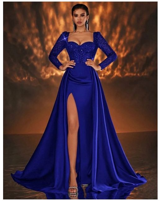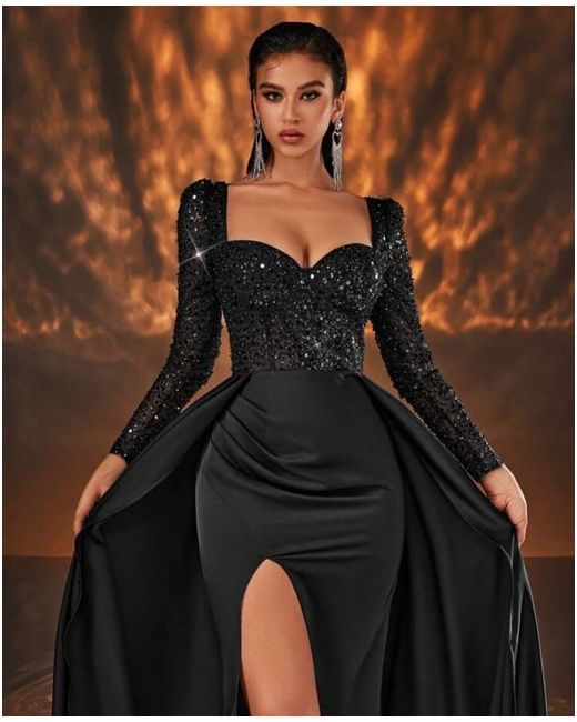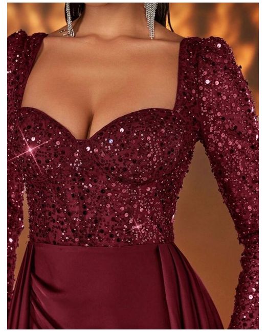 Queens Elegant Luxurious Sequin Patchwork Satin Sheer Long Sleeve Front Bust Cup Fish Bone Fishtail Side High Slit Back Floor Length Draped Formal Gown, Prom Evening Dress, Party Dress, For Wedding Guest, Graduation, Dinner