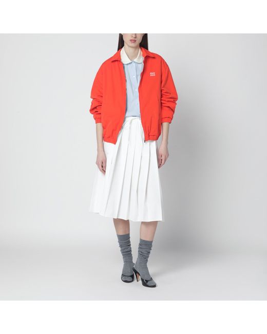 Orange cotton blouson by Miu Miu, featuring a classic collar, zip closure, front pockets, elasticated cuffs and hem, and embroidered logo on the chest.