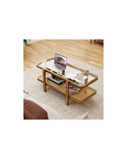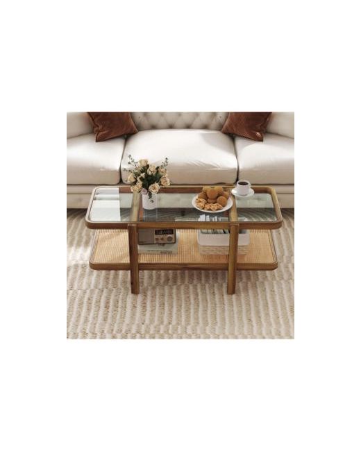 Elevate your living space with our rustic coffee table. This 2-tier cocktail table features a spacious tabletop and open shelf, perfect for organizing cups, books, baskets, and decorative items while keeping your area clutter-free. The tabletop is made from heat-resistant tempered glass, and the shelf is crafted from anti-fading Pe rattan for long-term use. The solid acacia wood frame ensures stability and durability, while non-slip foot pads provide added stability. Perfect for the living room, reception area, or study, this accent center table combines style with practicality. Bring this coffee table into your home and infuse your living space with rustic charm!