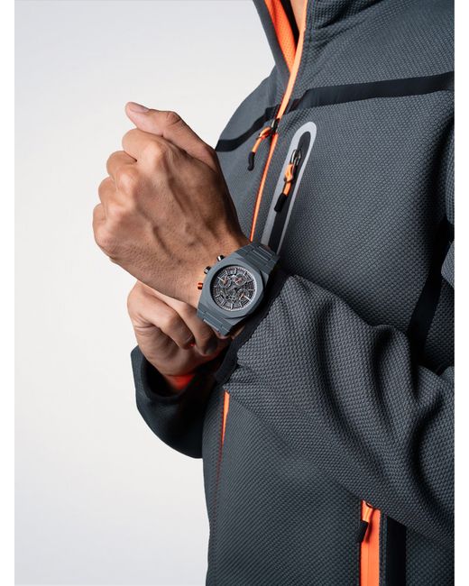 The dark grey monochrome palette is elevated by a skeleton dial that subtly exposes the movement beneath, adding depth and technical appeal. It features a 40.5mm case, bezel, and bracelet all crafted from ultra-light polycarbonate with a smooth soft-touch finish.