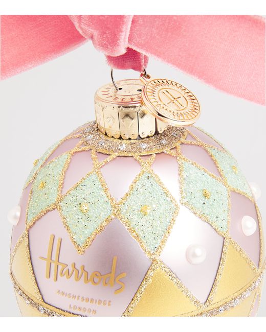 Elevate your seasonal decor with Easter egg hanging decoration, a sparkling keepsake where the gilded diamond panels add a layer of shimmering, opulent reflection to the design. The circumference is expertly delineated by two precise lines of small, imitation diamonds, creating a central band that frames the iconic Harrods name.