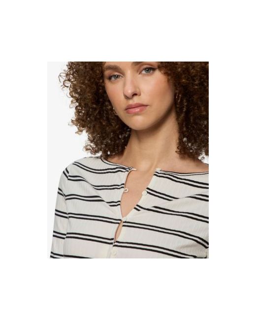 Sleek texture stands out in this ribbed top from Sanctuary, designed with a high neckline and long striped sleeves. A button front offers customizable styling for layered or standalone looks.