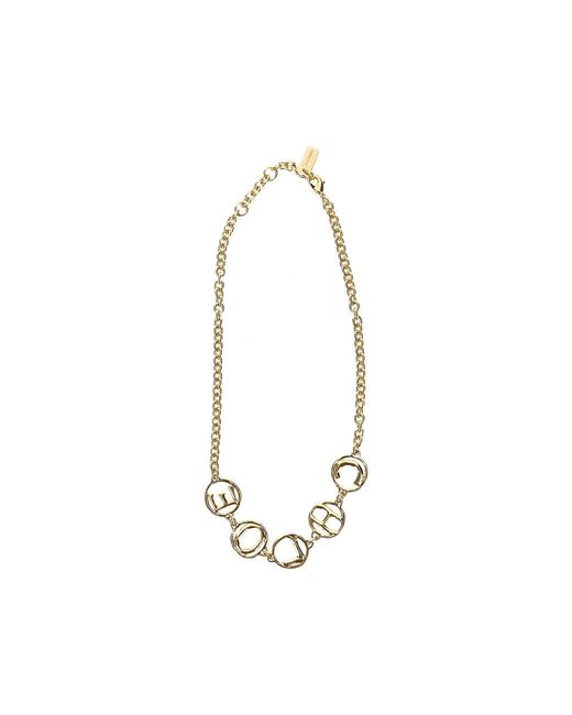 Chocker made from gold-finished brass chain, enriched with circular charms with lettering logo. Adjustable closure with snap-hook.