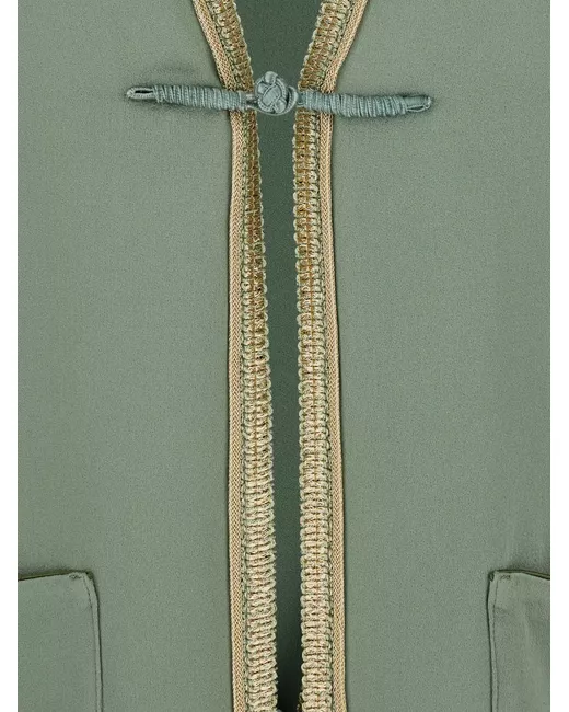 green trimmed front tie fastening long sleeves two front patch pockets V-neck