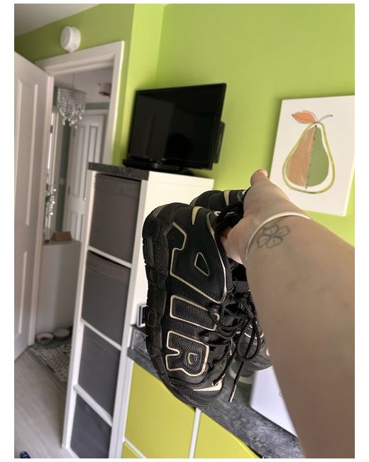 This product is a Women's Nike Air Uptempo trainers in size 5, featuring a classic black and gold colour scheme. The lace-up style, rubber outsole, and leather upper make them durable and comfortable for everyday wear. With the iconic Nike Air branding and logo accents, these sneakers offer a stylish and sporty look perfect for springtime activities. Made in Vietnam, these standard width trainers are a must-have for any sneaker enthusiast looking for a versatile and trendy addition to their collection. NO BOX