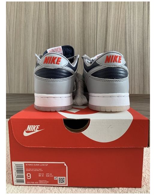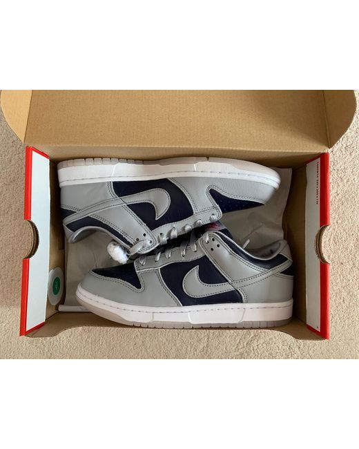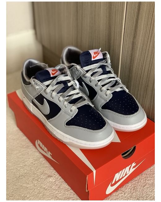 Clad in a premium leather construction, a combination of grey, navy and red overlays coats the panels across the silhouette.