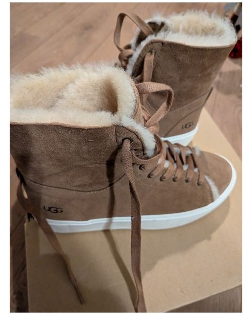 These UGG Sheepskin Ankle Boots in UK shoe size 5 are perfect for the winter season. The round toe shape and low heel height make them comfortable for casual occasions, while the shearling lining and suede upper material add a touch of luxury. The brown colour and logo accents give them a stylish look, making them a must-have addition to any woman's shoe collection. The UGG Australia brand ensures quality and durability, making these boots a timeless and versatile choice for the colder months.