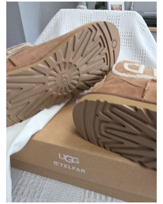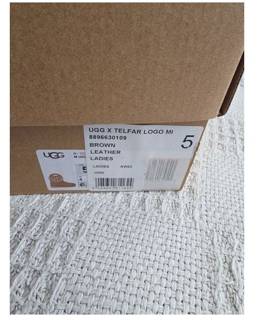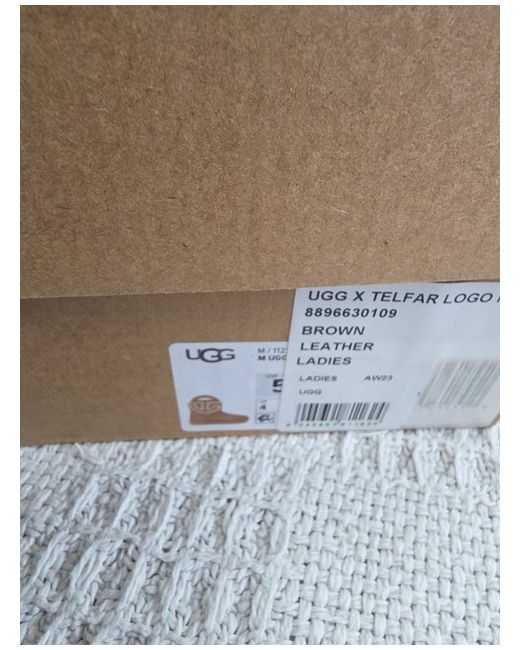 The UGG Telfar Logo Mini Ankle Boot in Brown Shearling Suede is a stylish and comfortable choice for women in UK size 4. With a round toe shape and a flat heel, these boots are perfect for casual occasions during the winter season. The shearling lining and sheepskin upper material provide warmth and luxury, while the rubber outsole ensures durability. This boxed boot comes with a bag, making it a convenient and chic addition to any wardrobe, especially for those who appreciate the UGG Australia brand and classic bootie style.