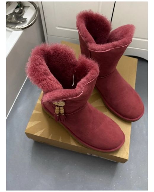 The Bailey Charms UGG Size 7.5 Women's Boots are stylish and comfortable footwear perfect for the winter season. Made with luxurious sheepskin, these red boots feature a round toe shape and standard shoe width, making them ideal for casual occasions. With the signature UGG Australia brand and the charming Bailey charms model, these boots are a fashionable addition to any woman's shoe collection. The boots are designed for a UK shoe size 7.5 (US size 9) and are a must-have for those looking for both style and practicality in their footwear.