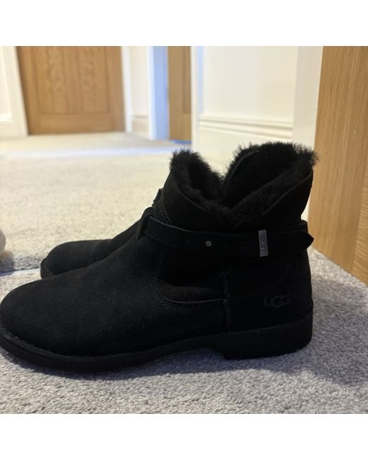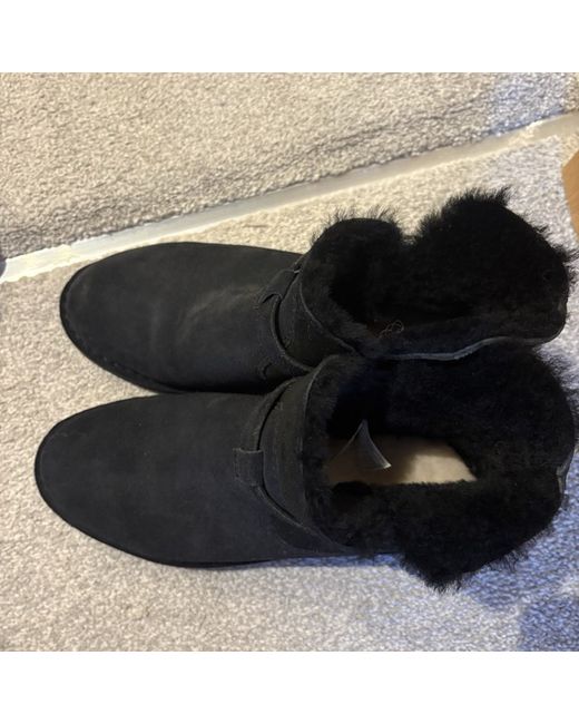 The product is a pair of UGG Australia black short boots in UK size 6 (US size 8, EU size 39). These round toe boots are made of suede and are designed for casual occasions during the winter season. The standard width boots feature the brand's logo as an accent and are not vintage or customised. Perfect for women looking for a stylish and comfortable snow boot option.