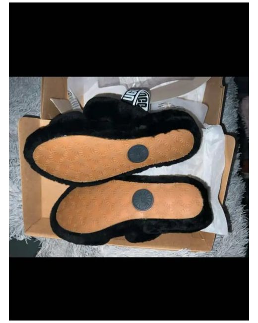 The UGG Australia sliders are a stylish and comfortable choice for women in UK shoe size 7. These black sandals feature a flat heel and are crafted from luxurious fur, giving them a trendy and plush look. The slider style adds a touch of convenience and ease to the design, making them perfect for casual wear and everyday outings. Perfect for adding a touch of sophistication to any outfit, these UGG sliders are a must-have addition to any woman's shoe collection.