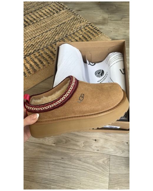 The UGG Tasman Platform Chestnut slippers are a stylish and comfortable choice for women, with a slip-on closure and low heel height making them perfect for casual wear during the winter season. Made with suede upper material and featuring a round toe shape, these brown slippers by UGG Australia offer both comfort and style. The platform design and signature logo accent add a touch of luxury to these slipper-style shoes, making them a versatile addition to any woman's wardrobe.