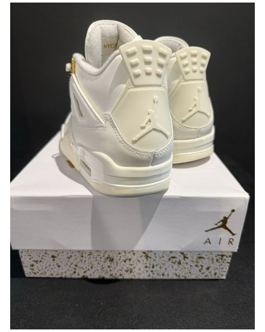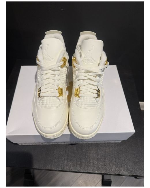 The product is a pair of Air Jordan 4 Retro Sail Metallic Gold sneakers in size 9.5 UK (12 US, 44.5 EU). This low-top trainer features a metallic gold colourway with a leather upper and standard shoe width. The retro-themed sneaker is part of the Air Jordan product line and is designed for women who appreciate the iconic Jumpman character associated with the Jordan brand. With a stylish and eye-catching design, this release from 2024 is sure to be a sought-after addition to any sneaker collection.