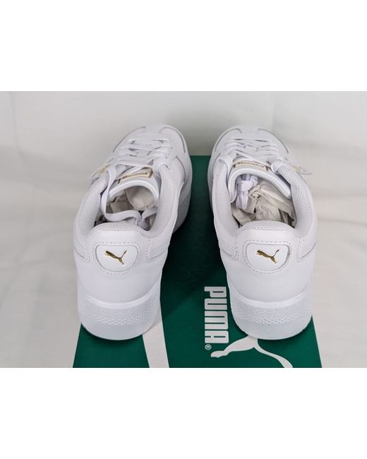 The product is a pair of women's PUMA Palermo Elevata Leather Sneakers Trainers in UK size 5. These white sneakers feature a rounded toe shape, lace-up closure, and a low-top shoe shaft style. Made from leather with a rubber outsole, they are designed for casual occasions and summer season. The trainers also have a flat heel style and a regular fit, suitable for walking activities. Perfect for women looking for stylish and comfortable footwear options.