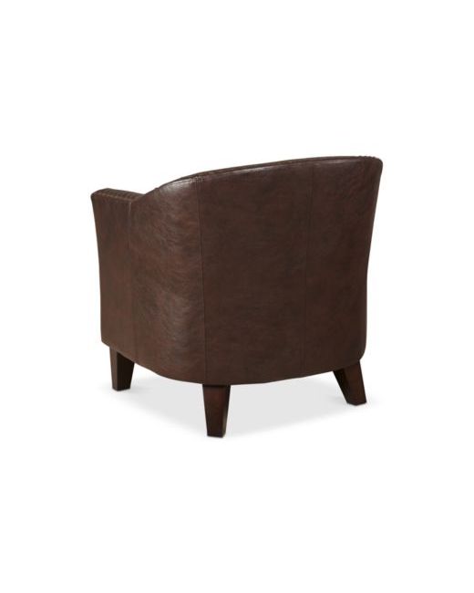 Provide a warm and inviting touch to any living space with the classic curves, timeless metal tacking, and smooth brown faux leather of this handsome and plush barrel accent chair.